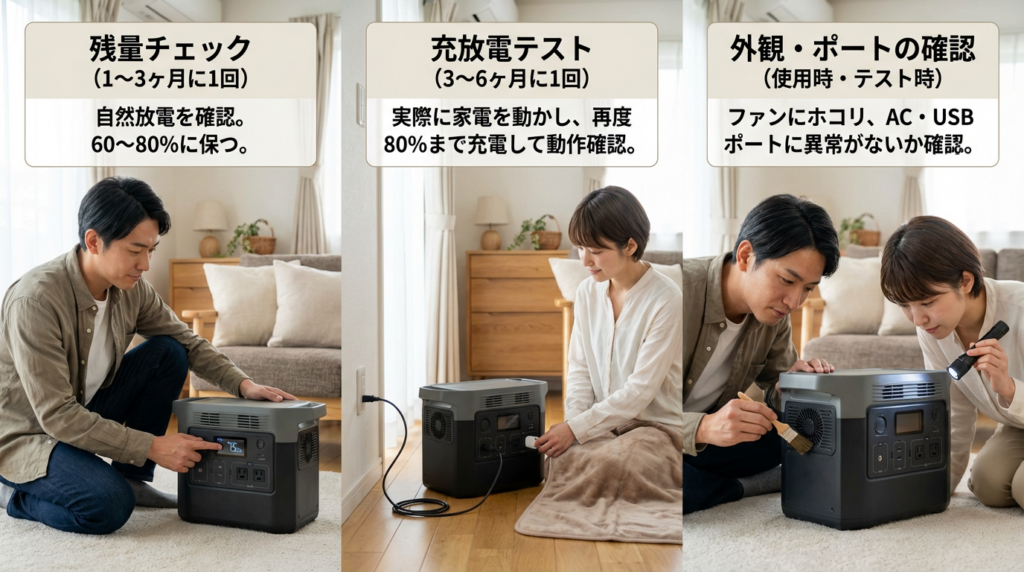 最低でも半年に1回、できれば3ヶ月に1回は、実際にスマートフォンの充電や家電を繋いでバッテリーを消費させ、再度適切な残量まで充電する「充放電テスト」を行うのがおすすめです。