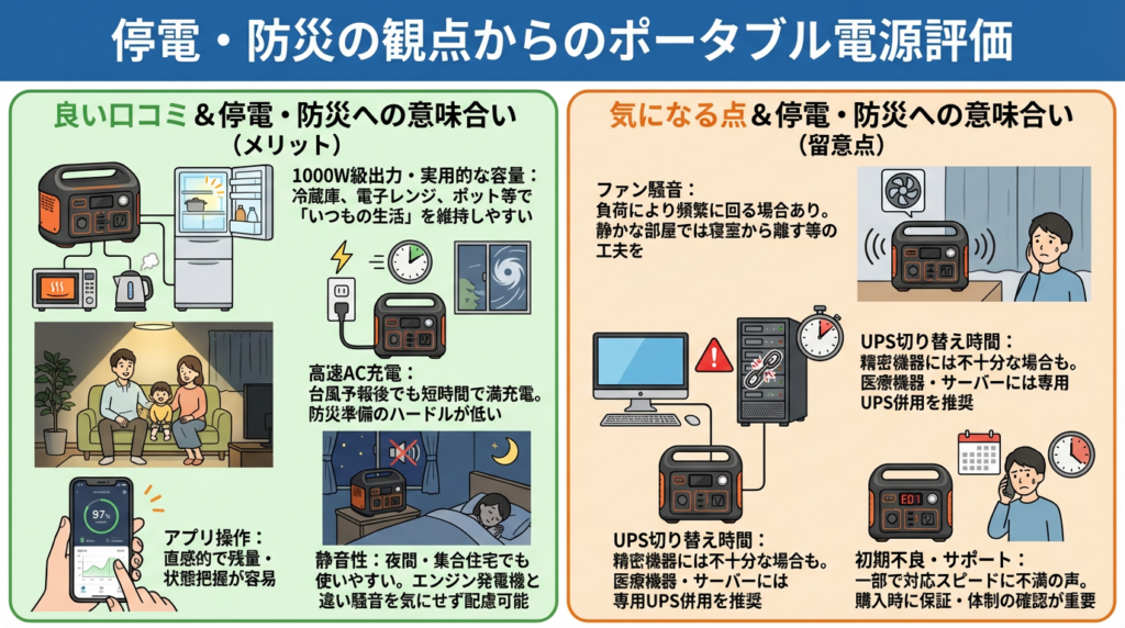 また、パソコンやネットワーク機器を接続して「準UPS(無停電電源装置)的」に使っているユーザーからは、瞬断レベルの停電であれば問題なく乗り切れたという報告もあります。