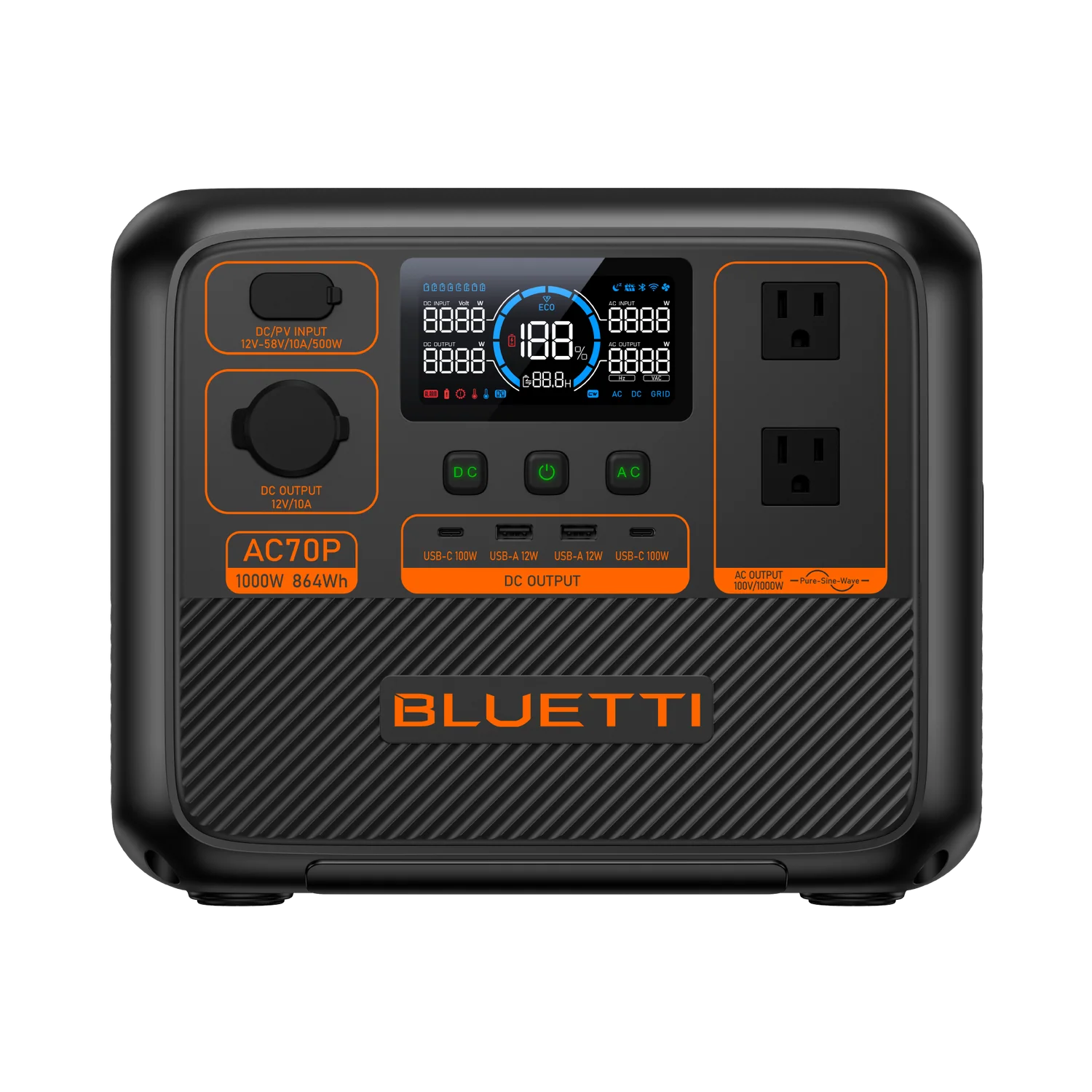 BLUETTI AC70Pは、容量864Wh・定格出力1000W(瞬間最大1500W)の万能型ポータブル電源で、リン酸鉄リチウム電池を採用し3000回以上の長寿命を実現します。