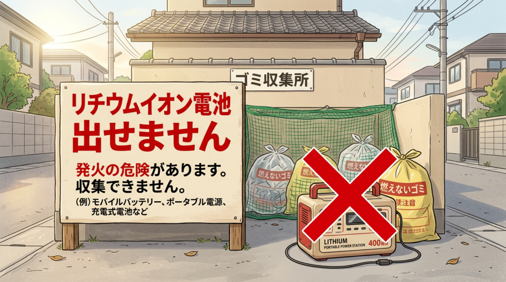 一般ゴミ(燃えるゴミ・燃えないゴミ・粗大ゴミ)には分類されません。リチウムイオン電池を内蔵しているため、ほとんどの自治体で「収集不可」の扱いです。メーカー回収や専門業者への依頼が必要になります。
