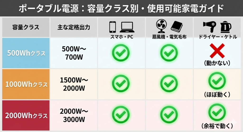 容量クラスによる使える家電の違いをまとめました。