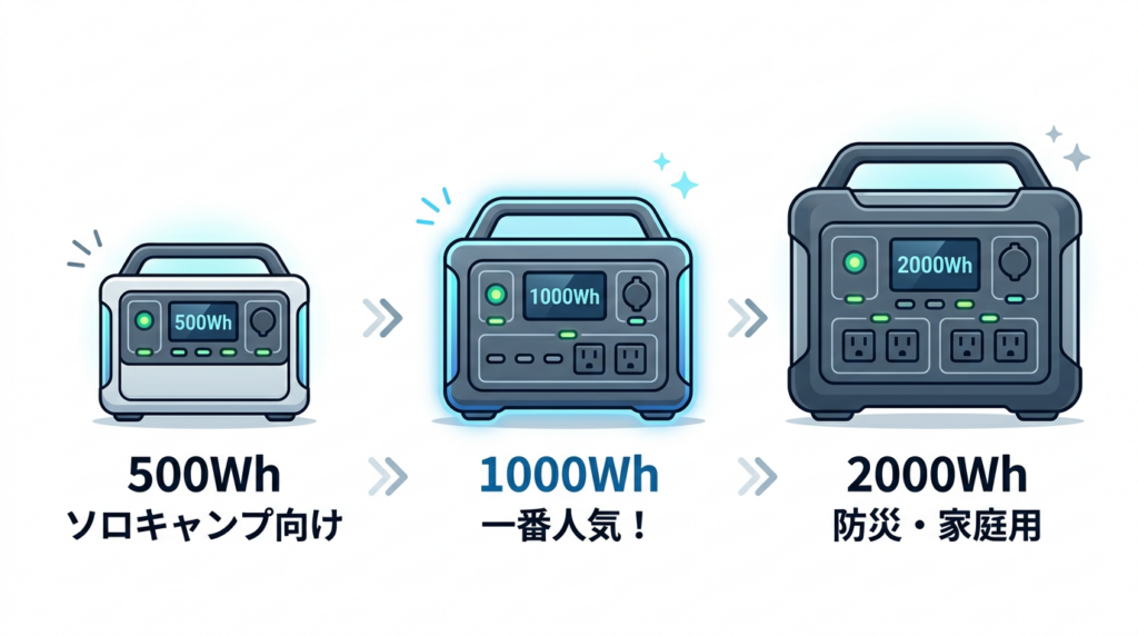 この記事では1000Whクラスに絞ってご紹介しましたが、用途によっては別の容量帯が合う場合もあります。