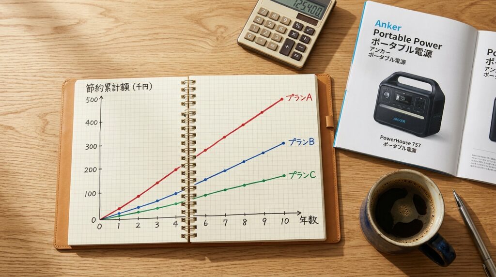 ピークシフトだけでは、10年寿命のリン酸鉄リチウムでも元を取るのは不可能です。ただし、これは「ポータブル電源単体でのコスト回収」の話であって、防災やキャンプでの活用価値は含んでいません。